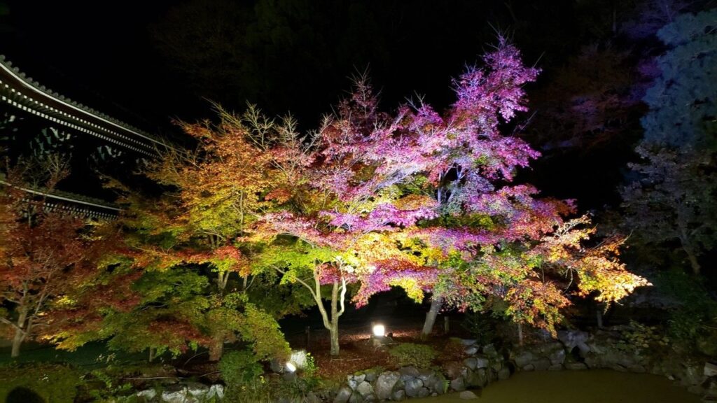本堂や三門だけでなく、庭園内も美しく照らされ、紅葉が光に浮かび上がる様子はまさに幻想的です。
