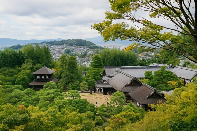 さらに、庭園内の小道を進むと、境内全体を一望できる展望スポットがあり、東山を背景にした美しい景観が楽しめます。