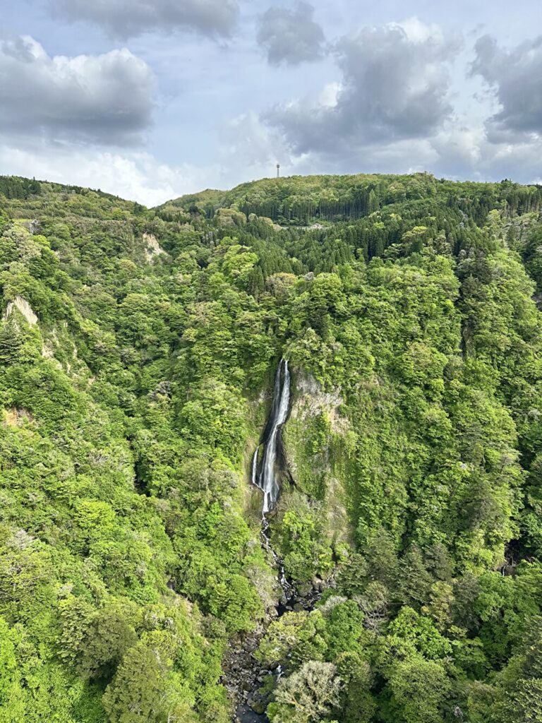 橋の下には「震動の滝(しんどうのたき)」や鳴子川渓谷が広がり、足元から見下ろす景色はスリル満点。晴れた日には遠くの山々まで見渡せ、春の新緑、夏の深い緑、秋の紅葉、冬の雪景色と、四季折々で全く違った表情を楽しめます。