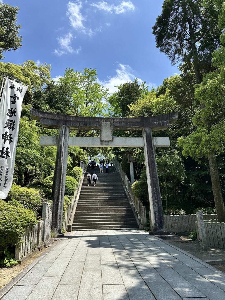 実際に訪れた際は、駐車場から少し歩き、露店が並ぶ参道を通って境内へ向かいました。階段を上り、振り返った瞬間に見えた、海へと一直線に伸びる参道とその先に広がる景色がとても印象的で、思わず立ち止まってしまいました。