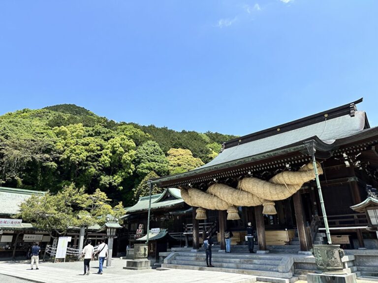 境内には、日本一とされる大注連縄(しめなわ)や大太鼓、大鈴があり、その迫力も見どころの一つ。海と山、そして信仰が結びついた独特の立地は、他の神社にはない魅力を持っています。観光と参拝を同時に楽しめる神社として、幅広い層に支持されています。