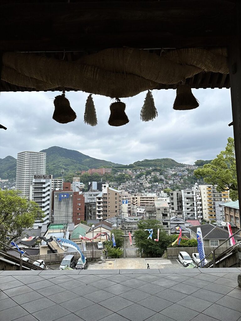 境内は高台に位置し、長い石段を登った先に本殿が鎮座しています。市街地にありながら静かな雰囲気が保たれており、参拝後には長崎市街を見渡せる眺望も楽しめます。歴史、信仰、祭り文化が一体となった、長崎を代表する神社です。