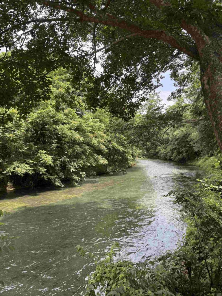 実際に訪れてみると、北アルプスの雪解け水が流れる澄んだ川と、整然と並ぶわさび田が広がり、想像以上に景色がきれいでとても印象に残りました。水の透明度が高く、緑も多いため、歩いているだけで気持ちが落ち着いていく感覚があります。