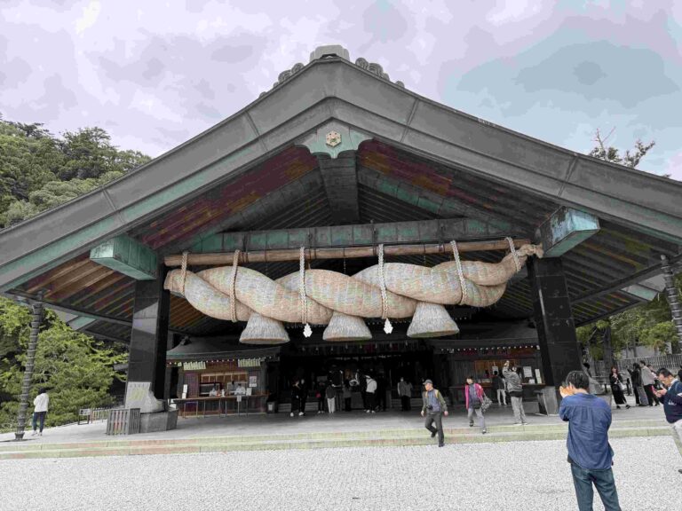 建築面でも出雲大社は特別です。本殿は日本最古の神社建築様式の一つ「大社造」で建てられ、現在も国宝に指定されています。高さ約24mの本殿は、日本神話に語られる“かつての巨大本殿”を想起させ、圧倒的な存在感を放ちます。神楽殿に掛けられた巨大なしめ縄も象徴的で、訪れる人に強い印象を残します。